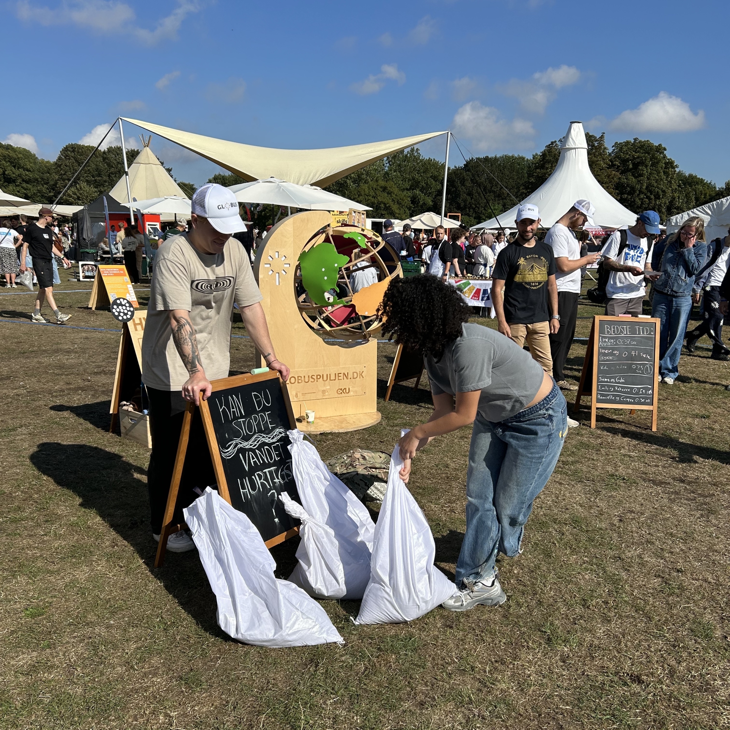 På Ungdommens Folkemøde blev de unge udfordret til at bygge en dæmning af sandsække for at holde vandmasserne tilbage. Selvom rekorden blev imponerende 21 sekunder, var det stadig langt fra hurtigt nok til at matche de virkelige udfordringer, som familier i Filippinerne står overfor, når oversvømmelser rammer.