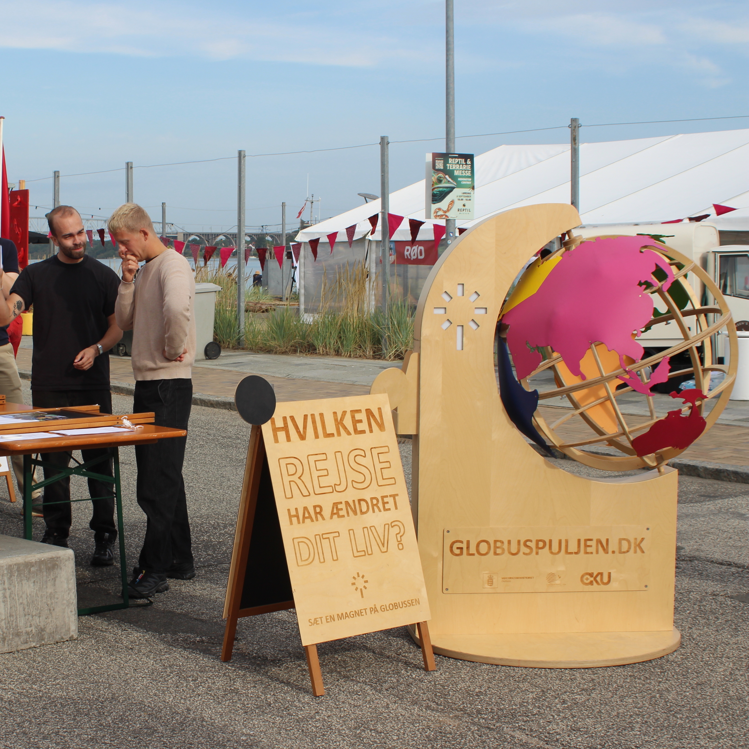 En stor, farverig globus fangede mange nysgerrige blikke. Med magneter markerede deltagerne deres drømmerejsemål – eller den rejse der allerede havde ændret deres liv. Aktiviteten blev en indgang til samtaler om, hvordan livet leves under helt andre vilkår – og hvordan vi sammen kan bidrage til en bæredygtig global udvikling.